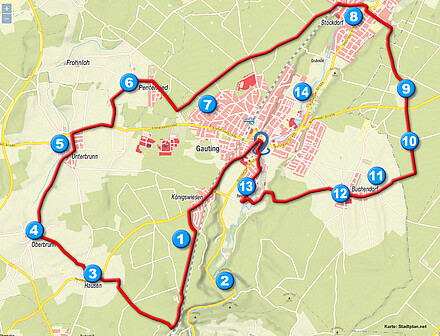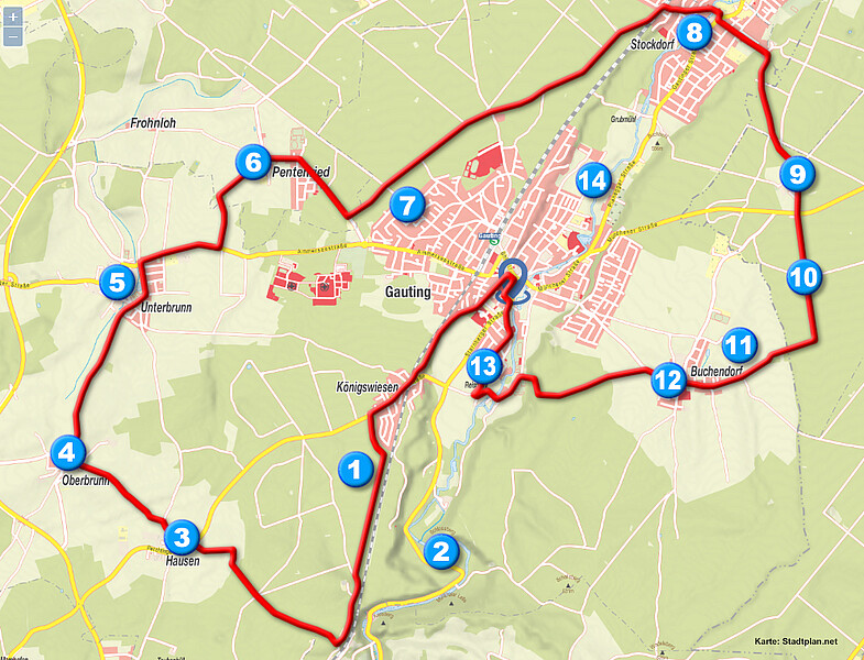 Westlich von Gauting kreuzt unsere Tour die alte Römerstrasse rechtwinklig. Die Trassenführung dieser Strasse Richtung Gilching ist seit fast 2000 Jahren exakt die Gleiche geblieben. Die alte Römerstrasse verband die wichtigen Garnisonsorte Salzburg und Augsburg.