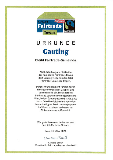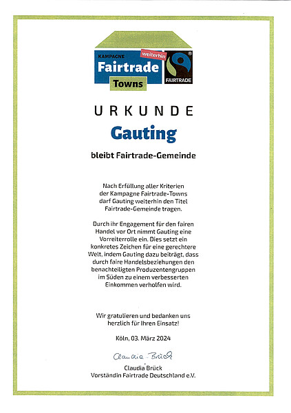 Seit der ersten Verleihung des Titels an die Gemeinde Gauting im März 2012 wurden die für diese Ehrung notwendigen Kriterien alle zwei Jahre von Fairtrade Deutschland e.V. überprüft. Die Kampagne Fairtrade Towns hat die Verlängerung des Titels nun erneut bestätigt.