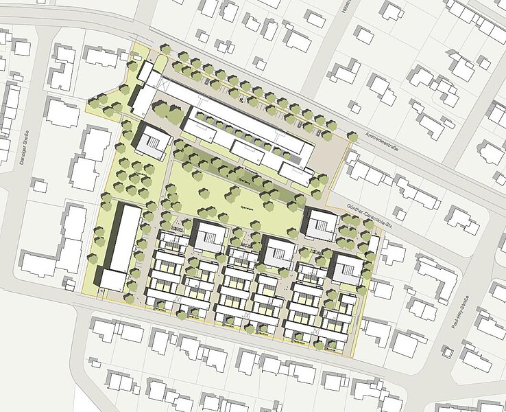 „Die noch unbebauten Grundstücke im Bebauungsplanumgriff sollen überwiegend für sozialen Wohnungsbau, angrenzend an die bereits vorhandenen Gebäude in der Danziger Straße, verwendet werden. Diese Fläche ist eine der wenigen Flächen im Gemeindegebiet, wo eine Unterbringung dieser Nutzung überhaupt noch möglich ist. Gleichzeitig ist aber auch die Abgrenzung dieser Fläche zum nördlich angrenzenden Gewerbegebiet in Hinsicht auf die Forderungen des Immissionsschutzes zu lösen, ebenso wie die verkehrliche Anbindung an das übergeordnete Straßennetz. Darüber hinaus ist für das Gewerbegrundstück der Rahmen der zukünftigen Bebaubarkeit und der damit verbundenen Erschließung abzustecken.“