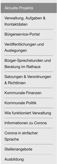 - am rechten Bildschirmrand finden Sie den schnellen Zugriff zu wichtigen Informationen (Kontakt, Öffnungszeiten, Terminvereinbarung, Bürgerservice-Portal und Rats-Info-Portal). Weiter unten - über das Strich-Männchen können Sie ein Menü aufrufen, und hier weitere barrierefreie Anpassungen vornehmen.